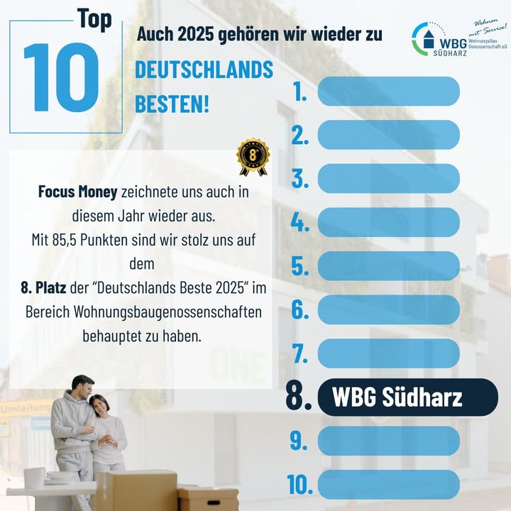 Unsere WBG Südharz wurde von FOCUS MONEY und DEUTSCHLAND TEST als eine der besten Wohnungsbaugenossenschaften Deutschlands ausgezeichnet.