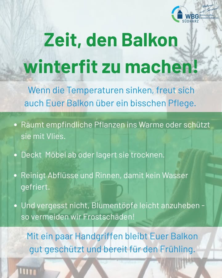 Der Winter steht vor der Tür – Zeit, den Balkon für die kalte Jahreszeit fit zu machen. Hier sind unsere Tipps, damit Pflanzen, Möbel & Co. gut durch die Frostzeit kommen.