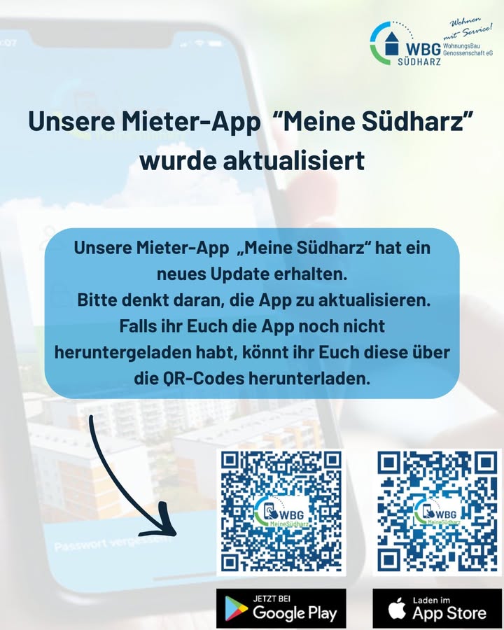 Herzlichen Dank an unsere zahlreichen „Meine Südharz“- Registrierungen! Über 2000 Mitglieder nutzen schon unsere WBG-Service-App und machen damit das Wohnen ein ganzes Stück einfacher. Euer WBG-Team ...