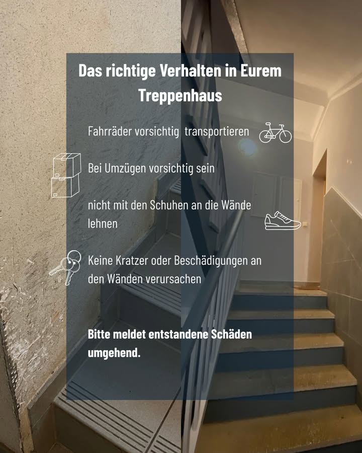 Damit Euer Treppenhaus sauber, sicher und einladend bleibt, bitten wir Euch um Rücksicht: