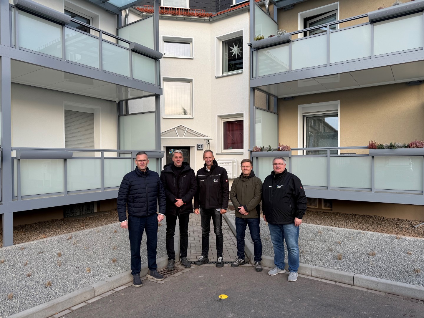 Am 16. Dezember trafen sich die Mitglieder des Fachausschusses Wohnen des Aufsichtsrates der Wohnungsbaugenossenschaft Südharz (WBG) zu einer themenbezogenen Sitzung mit dem Vorstand Wohnen, Sven Dörmann, und dem Leiter und Prokurist der Abteilung Technik der Genossenschaft, Michael Ose. Der erste Teil der Zusammenkunft fand in Form eines Vorort-Termins in Nordhausen im WBG-Quartier zwischen Bochumer Straße und An der Bleiche statt. An die dortigen sanierten Altbauten aus den 20-er und 30-er Jahren des vergangenen Jahrhunderts wurden in den zurückliegenden Monaten 111 große Balkone angebaut (wir berichteten dazu bereits ausführlich). Gunther Hebestreit, Stephan Klante und Mike Szybalski überzeugten sich von der guten Arbeit der vielen eingebundenen Fachfirmen. Sie zeigten sich sehr beeindruckt, wie sich durch diese komplexe Maßnahme die Wohnqualität in diesem Quartier erheblich verbessert hat.